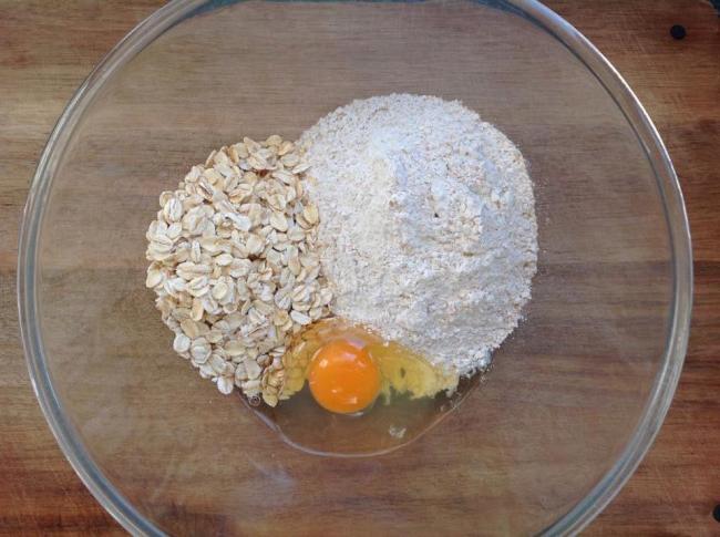 - Stir the egg and oil through flour, oats and salt with a fork